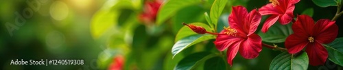 Fototapeta premium Red mandevilla blooms in a shaded area with lush greenery, botany, mandevilla...