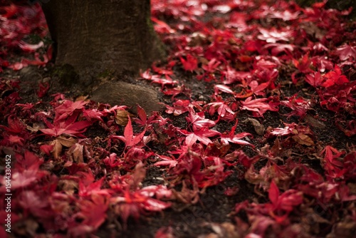 Fototapeta premium Red maple leaves by trees trunk during autumn