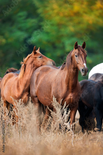 © kwadrat70, Fototapeta premium Red mare with foal on fall pasture