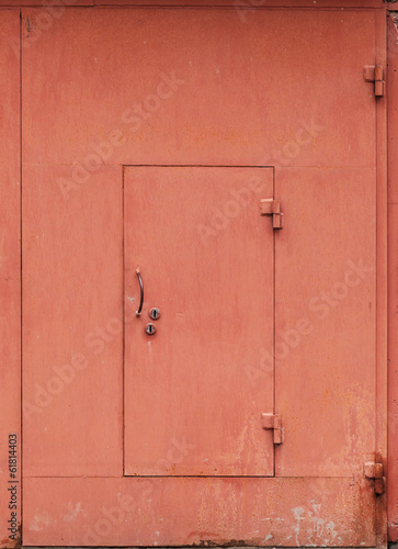 © evannovostro, Fototapeta premium Red metal garage wall with locked door. Background texture