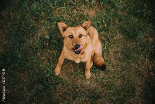Naklejka premium red mixed breed dog sitting on grass in summer, top view
