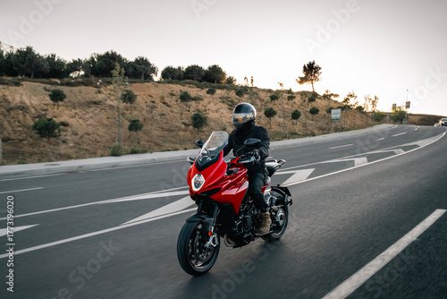 Fototapeta premium red Motorbike Riding on Road at Sunset – Adventure Lifestyle Concept