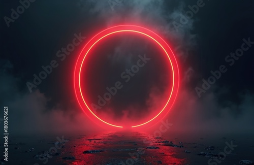 © miss irine, Fototapeta premium Red neon circle glows on dark wet ground with mist. Abstract glowing ring offers empty space for text overlay. Futuristic design element, digital art, mysterious atmosphere.