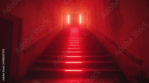 © aby.std, Fototapeta premium Red Neon Staircase in Abandoned Building