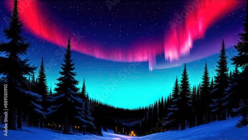 Naklejka premium Red Northern lights in the sky above the forest