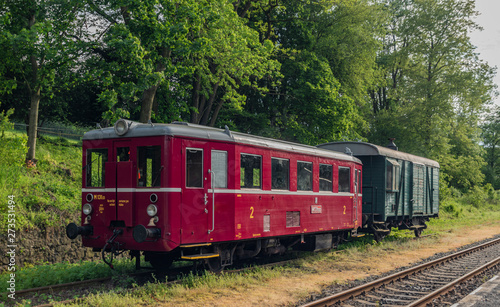© luzkovyvagon.cz, Fototapeta premium Red old historical diesel train with cargo green car in Ceska Kamenice town