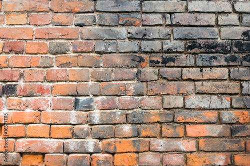 Obraz premium Red old worn brick wall with black spots texture background.
