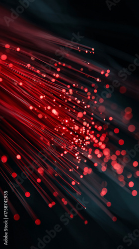 Fototapeta premium Red optical fibers glowing in the dark, symbolizing high-speed internet, data transfer, and modern network infrastructure, representing innovation, connectivity, and digital communication.