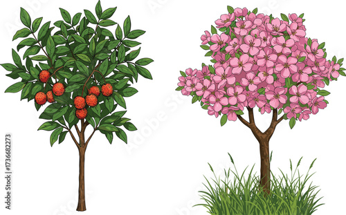 Fototapeta premium Red orange fruit, pink blossom tree, green grass cluster, botanical diversity, seasonal contrast, nature study, plant structure, foliage texture, landscape vegetation