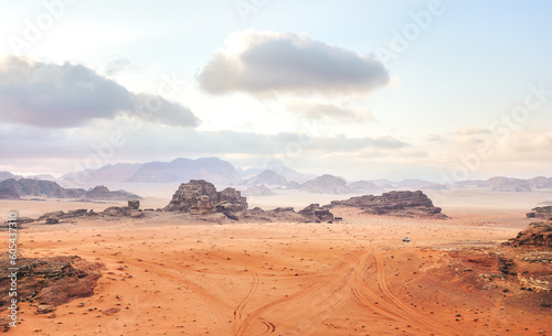 © Lubo Ivanko, Naklejka premium Red orange Mars like landscape in Jordan Wadi Rum desert, mountains background overcast morning, small vehicle distance for scale. This location was used as set for many science fiction movies
