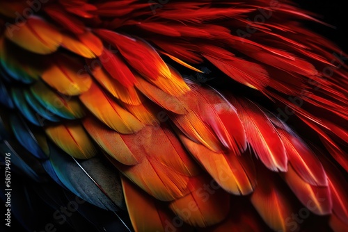 © masharinkaphotos, Obraz premium Red, orange, yellow wing feathers of macaw parrot, colorful tropical background. Generative AI
