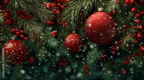 Fototapeta premium Red Ornaments, Winter Snow, Festive Decor