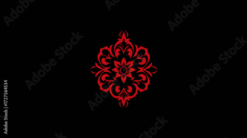 © nevermind, Fototapeta premium Red ornate floral design centered on a black background, resembling a stylized emblem or decorative element.