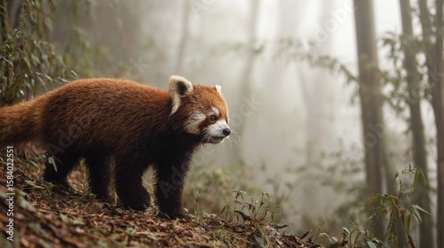 © Anat art, Fototapeta premium Red Panda Explores Bamboo Forest in Misty Mountain Setting Capturing the Essence of Nature