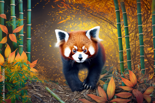 Naklejka premium Red Panda in the autumn bamboo forest with warm colors and many yellow and...
