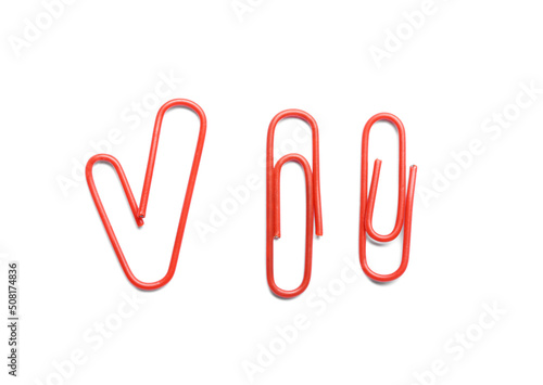 © Pixel-Shot, Obraz premium Red paper clips on white background