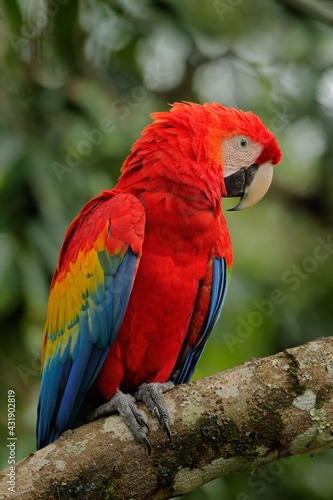 © ondrejprosicky, Fototapeta premium Red parrot Scarlet Macaw, Ara macao, bird sitting on the branch, Costa rica. Wildlife scene from tropical forest. Beautiful parrot on tree green tree in nature habitat.