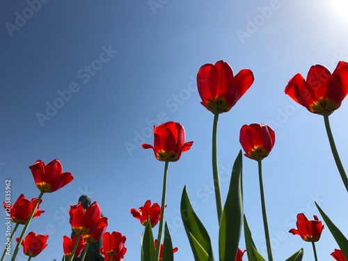 © Karen Vardanian, Obraz premium Red perfect flowers in the field view from below in sunlight