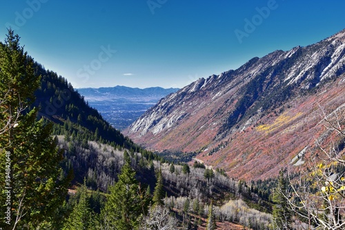 Fototapeta premium Red Pine Lake views from trail mountain landscape towards Salt Lake Valley in Little Cottonwood Canyon, Wasatch Rocky mountain Range, Utah, United States.