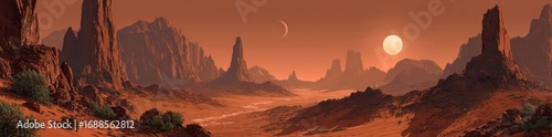 Naklejka premium Red planet landscape with towering rock formations, a crescent moon, and a large sun