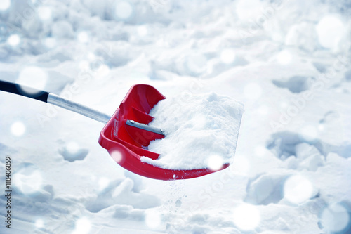 © Africa Studio, Fototapeta premium Red plastic shovel for snow. Snow effect