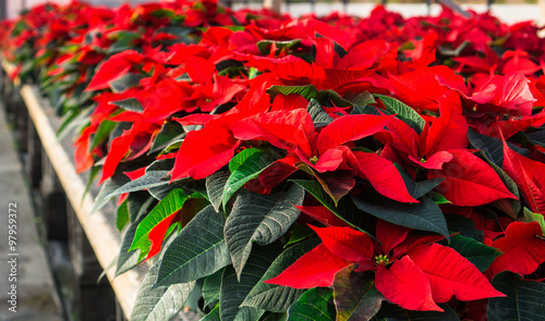 Fototapeta premium Red Poinsettias ready for sale for the winter Holiday season
