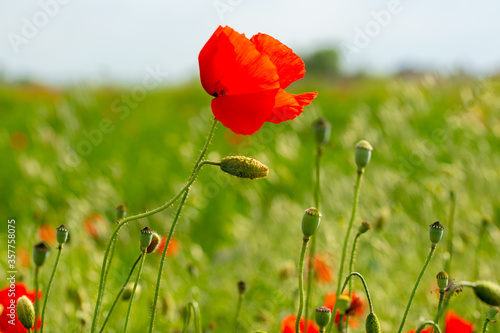 © florinfaur, Obraz premium red poppies and vegetation on the green plain