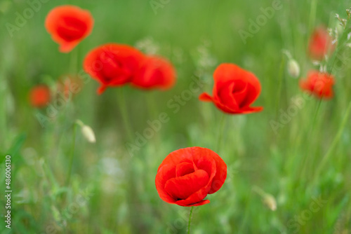 Fototapeta premium red poppies bloom on a green field