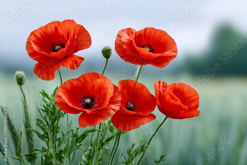 © kardaska, Fototapeta premium Red poppies blooming in green wheat field