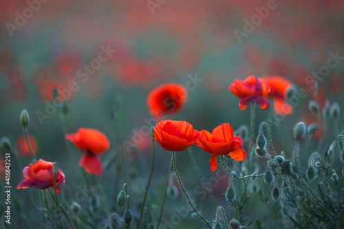 © Екатерина Дмитренко, Obraz premium Red poppies close-up on a blurry background. Poppy field. Spring background.
