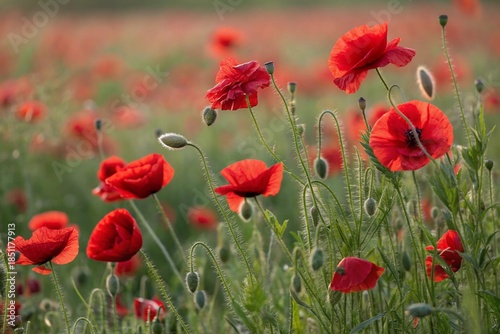 © Anastasiia Kasina, Fototapeta premium Red poppies field blooming in spring. Closeup view