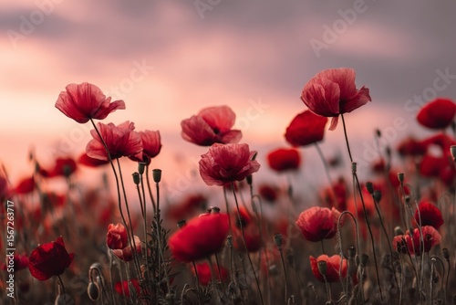 © Rawdah, Fototapeta premium Red Poppies in a Field at Sunset