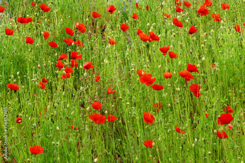 Fototapeta premium Red poppies in a green field