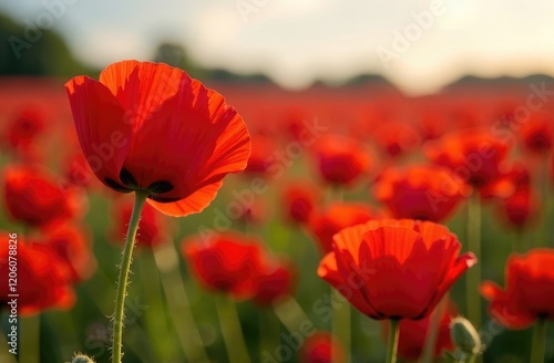 Fototapeta premium Red poppies in a poppies field. Remembrance or armistice day.