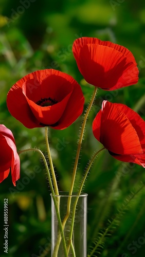 © Venture Bell, Obraz premium Red poppies in glass vase on green background