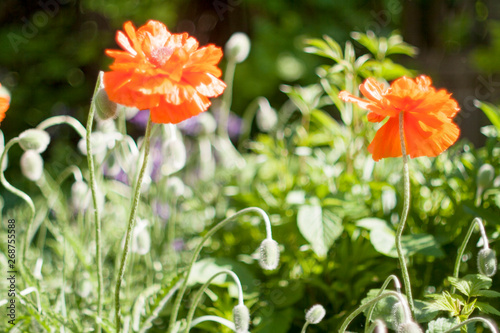 © Panas, Fototapeta premium red poppies on a green blurred leaf background