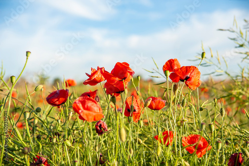 Obraz premium Red poppies on the meadow. Sunny summer day.