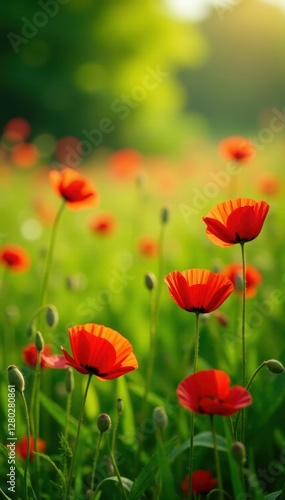 Fototapeta premium Red poppies scattered across a lush green summer meadow, bathed in sunlight , nature, petals, stem
