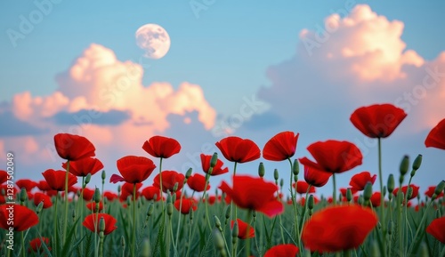 Fototapeta premium Red poppies sway in a vibrant field under a bright moonlit sky with fluffy clouds at dusk