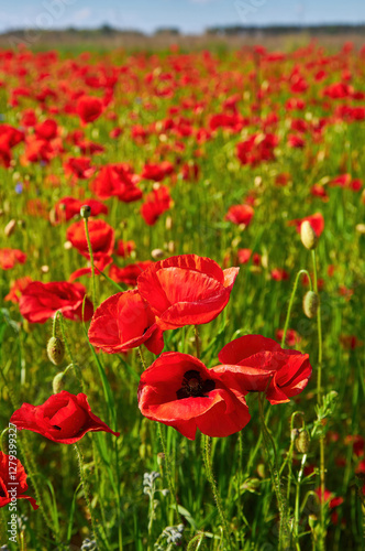 © Ryzhkov Oleksandr, Fototapeta premium Red Poppies Under Cloudy Blue Sky