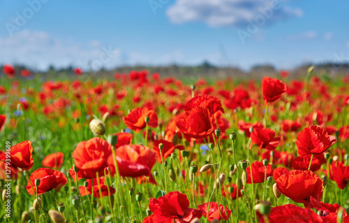 © Ryzhkov Oleksandr, Obraz premium Red Poppies Under Cloudy Blue Sky