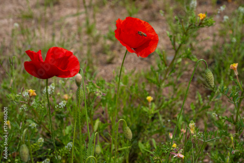 © 완수 안, Fototapeta premium Red Poppies with Hovering Bee in Natural Field