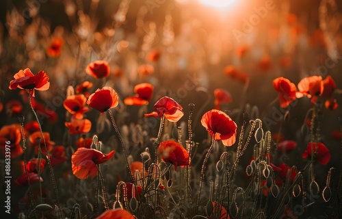 Obraz premium Red Poppy Field at Golden Hour Sunset