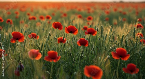 Fototapeta premium Red poppy field at sunset