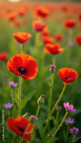 © Sayfar, Fototapeta premium Red poppy field with a few cornflowers and cosmos, green grass, cosmos