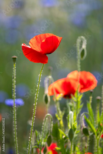 © 완수 안, Fototapeta premium Red poppy flower blooming in spring meadow