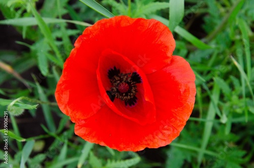 © Yaroslav, Fototapeta premium Red poppy flower on a green background about.