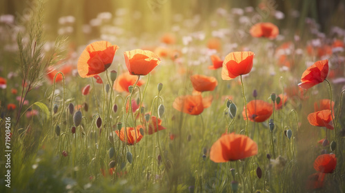 © tonktiti, Fototapeta premium Red poppy flower on sunset sky abstract background. Generative ai.