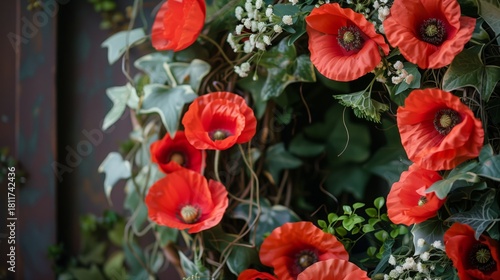 Fototapeta premium Red Poppy Flowers and Greenery Wreath Decor