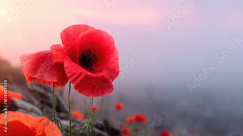 © ElenaX, Obraz premium Red poppy flowers blooming in misty meadow